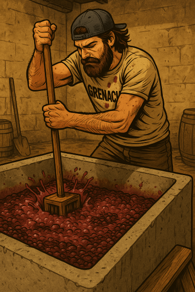 “Now you’re talking. Punching down the cap, pumping over — that’s where you really get your hands dirty. It’s not just about sugar and yeast — it’s about colour, tannin, and mouthfeel. That cap of skins and pips floats to the top and if you don’t work it, you lose the soul of the wine.”
